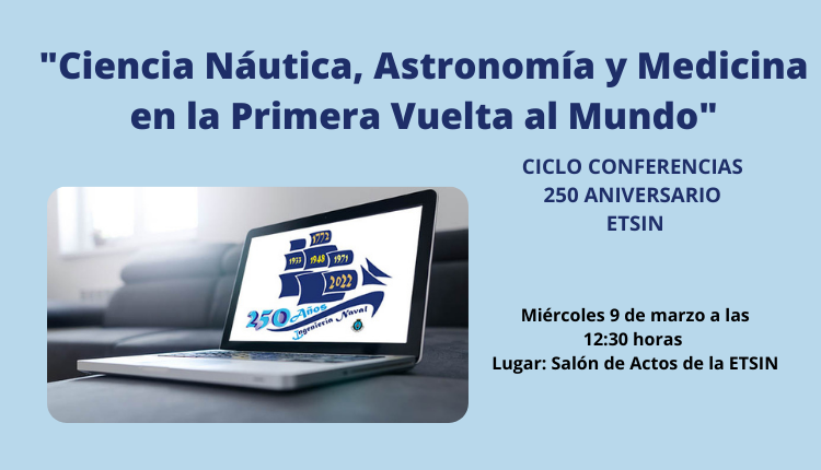 Con motivo de los Actos Conmemorativos del 250 Aniversario de los Estudios de Ingeniería Naval, el Miércoles 9 de Marzo a las 12:30 horas tendrá lugar en el Salón de Actos de la ETSIN, la Conferencia que con el Título “Ciencia Náutica, Astronomía y Medicina en la Primera Vuelta al Mundo”, impartirá el Dr. en Medicina y Especialista en la primera circunnavegación D. Javier Ángel Almazán Altuzarra.