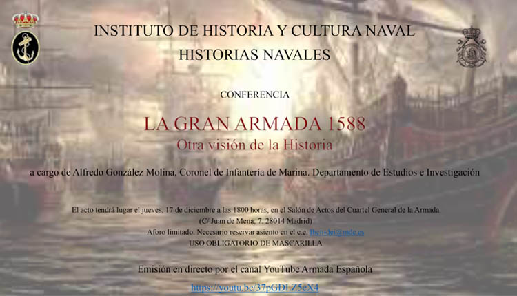 EI IHCN ha reanudado su ciclo de “Historias navales”. El Departamento de Estudios e Investigación (DEI) presenta la V Conferencia presencial/online «La Gran Armada 1588. Otra visión de la historia», ofrecida por el Coronel de Infantería de Marina (IM) Alfredo González Molina.