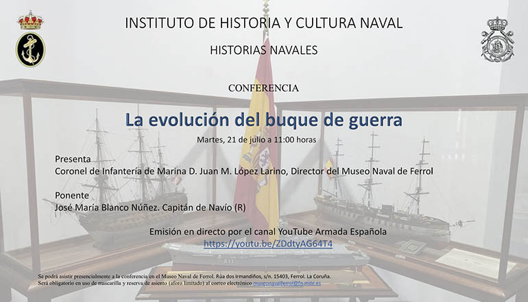 La primera ponencia la impartirá el CN (R) José María Blanco Núñez quien hablará sobre “La evolución del buque de guerra” el próximo martes, día 21 de julio a las 11:00h, desde el Museo Naval de Ferrol, con aforo limitado y previa reserva de asiento en el correo electrónico museonavalferrol@fn.mde.es, y online a través del canal YouTube Armada Española https://you.tube/ZDdtyAG6474