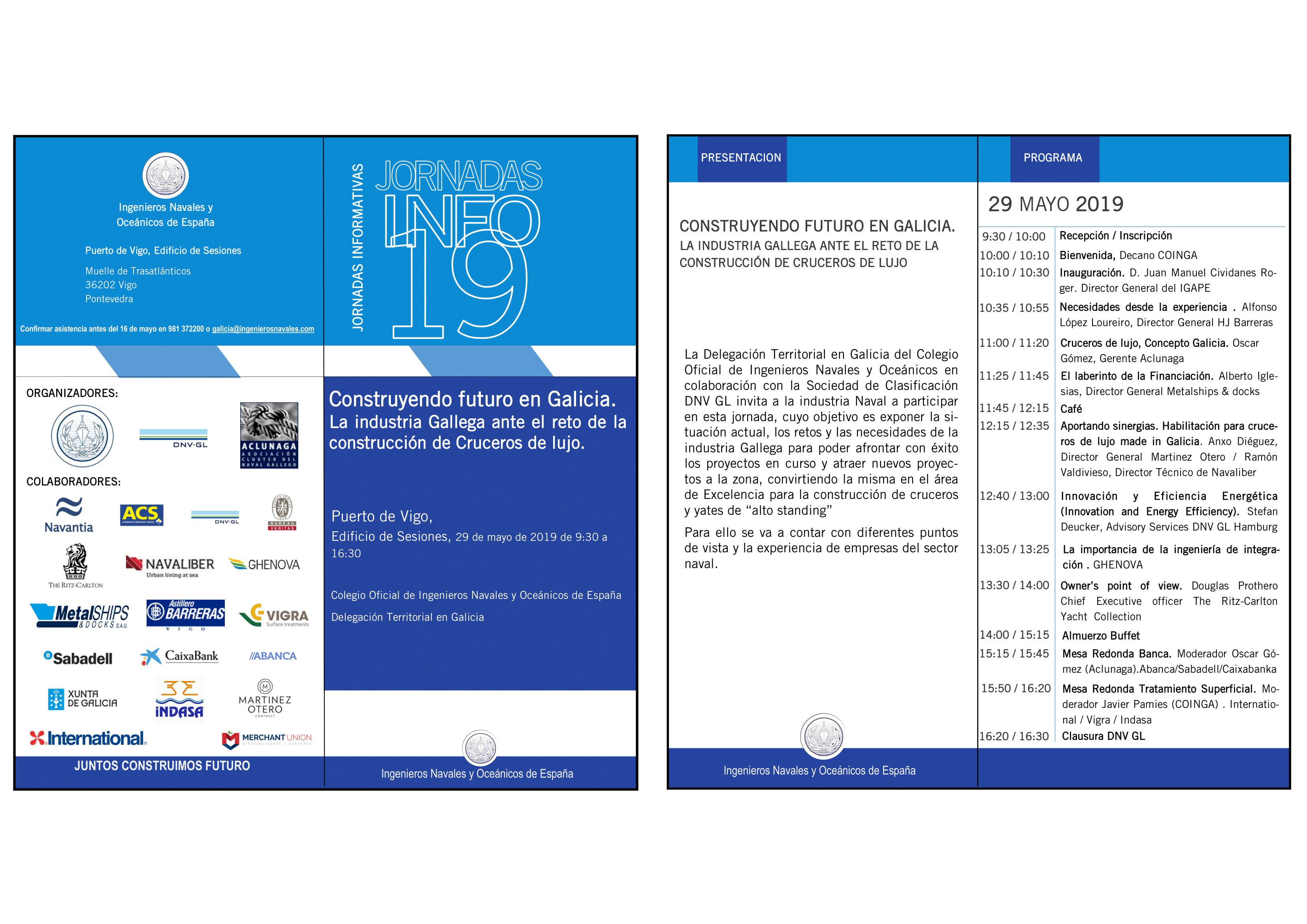 La Delegación Territorial en del Colegio Oficial de Ingenieros Navales y Oceánicos en colaboración con la Sociedad de Clasificación DNV GL y ACLUNAGA, invita a la industria naval a la JORNADA INFORMATIVA: CONSTRUYENDO UN FUTURO EN GALICIA. LA INDUSTRIA GALLEGA ANTE EL RETO DE LA CONSTRUCCIÓN DE CRUCEROS DE LUJO. El objetivo de esta jornada es exponer la situación actual, los retos y necesidades de la industria Gallega para poder afrontar con éxito los proyectos en curso y atraer nuevos proyectos a la zona, convirtiendo la misma en el área de Excelencia para la construcción de cruceros y yates de “alto standing”. Para ello se va a contar con diferentes puntos de vista y la experiencia de empresas del sector Naval.