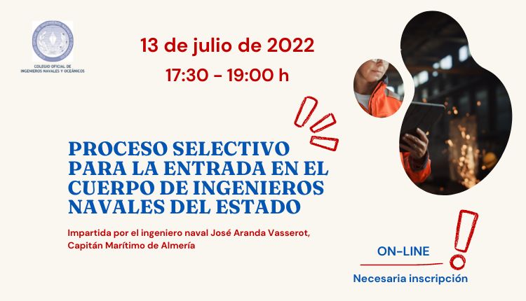 El Colegio Oficial de Ingenieros Navales y Oceánicos (COIN) ha organizado para el próximo 13 de julio una Sesión informativa ON-LINE* sobre el Proceso selectivo para la entrada en el Cuerpo de Ingenieros Navales del Estado. Impartida por José Aranda Vasserot, I. N., capitán marítimo de Almería.